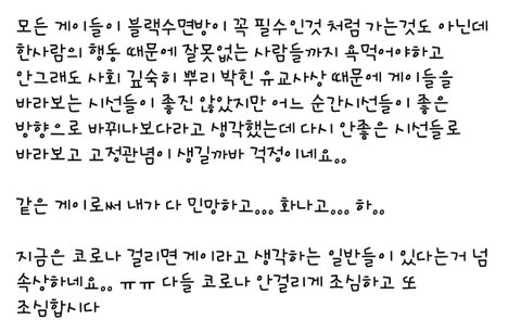 여러분들 저희는 동성애자라서 코로나에 걸린 게 아닙니다.운이 나빴다면 여러분들이 5월1일, 이태원이아닌 여러분들이 갔던 강남, 홍대 클럽 에서도 확진자가 있었을 수 있던 거 에요. 절대, 코로나의 확산이 동성애의 혐오로 이어져선 안됩니다.