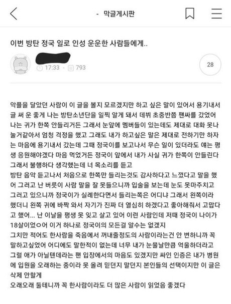 정국이한테 지랄 좀 하지마 제발 니네 그냥 정국이가 싫은거잖아