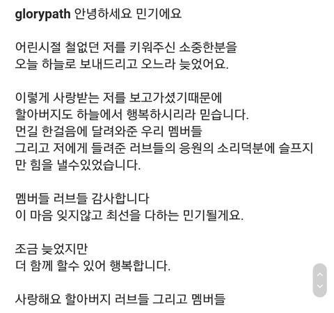 지난 3월 14일 민기는 안타깝게 조부상을 당하게 되었어. 어릴 적부터 바쁜 부모님을 대신해 민기가 연습생으로 상경할 때까지 대신 돌봐주실만큼 민기는 할아버지 할머니와 친했고, 그만큼 더 민기한테 가슴 아픈 이별이었을 거 같아.