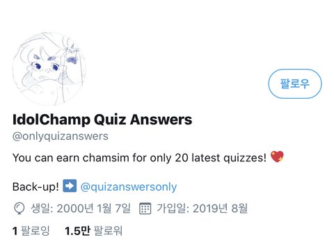 https://twitter.com/onlyquizanswers 여기로 들어가면 퀴즈 답 다 있어! 우리 할수잇잖앙