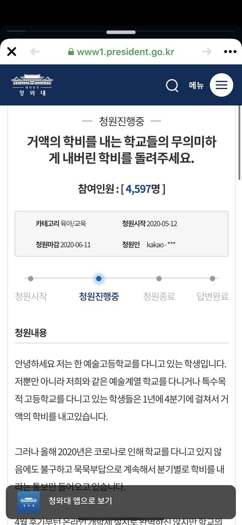 하지만 내가 예고를 다닌다고 했잖아 예고는 학비를 4분기 별로 돈을 내. 지금 1분기,2분기 돈을 낸 상태고 이제 3분기 돈을 내라고 문자가 왔더라고 근데 우리가 1분기때는 학교도 가지않고 심지어는 온라인개학도 하지않은 상태에서 학교에서 배운 것도 없는데 백이 넘는 그 큰 돈을 내고 돌려받지 못한다는 건 우리 학생들과 학부모님들이 생각하기엔 억울하다고 느껴져.