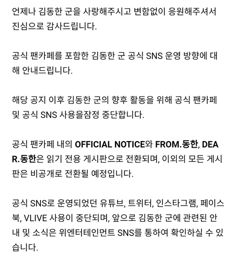 김동한 공식 팬카페 및 SNS 운영 잠정 중단된다는 공지 뜸