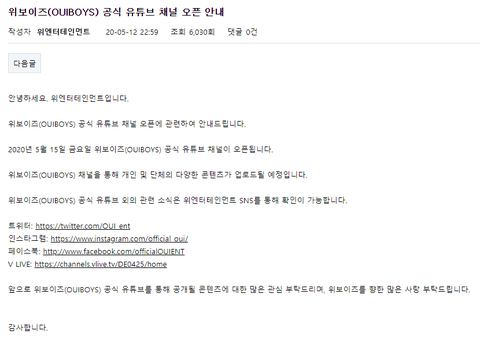 위보이즈(OUIBOYS) 공식 유튜브 채널 오픈한다는 공지도 뜸......