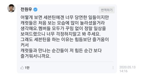 항상 애들이 마냥 밝게 저희는 무대가 좋아요 무대밖에 몰라요 이래서 우리가 몰랐던거지 저게 애들 일상이고 현실이니까...조금 놀랐는데 원우 말처럼 애들이 무대를 위해서 저렇게까지 노력하는구나 하면 될 듯..세븐틴 늘 고마워