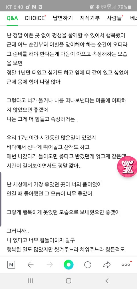 앙키야 고마워 17년간 부족한 우리 만나서 즐거운 시간을 보내게 해줘서 정말 너무너무 고마워 아픈데 말도 못하고 울지도 않고 주사 맞아도 씩씩하게 안아픈척 해줬던거 같아 너무 미안하고 고민워.. 하루라도 딱하루만 예전처럼 바다에서 뛰어노는 모습을 보고싶은건 너무 욕심이 컸나봐.. 미안하고 사랑해