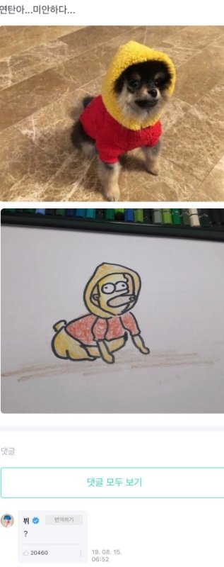 설명:자신을 심슨으로 그려달라고 요청-팬분이 연탄이(뷔 강아지)를 심슨(?)으로 그려서 올림