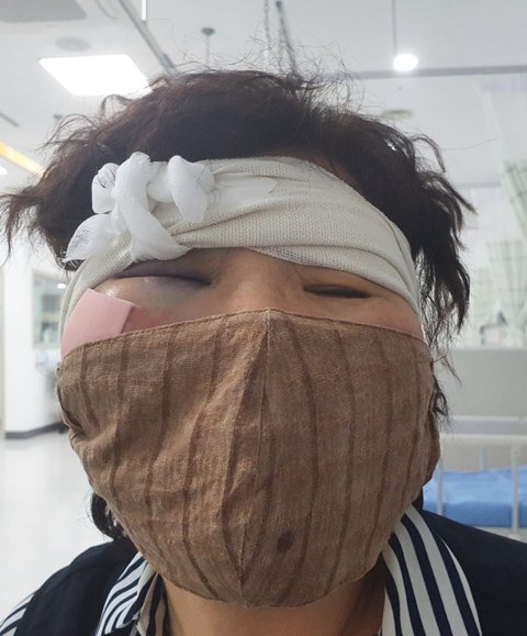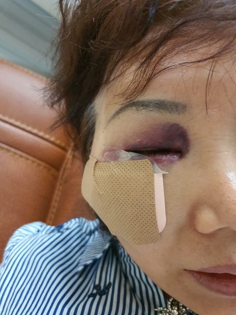 눈쪽을 다치셔서 눈이 제대로 떠지지도 않고, 광대뼈를 시작으로 오른쪽 눈은 까맣게 멍으로 뒤덮힌 상황입니다.
