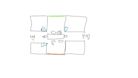 지금 생각해 보니 그 집의 구조가 좀 특이함. 방이 네 개고 복도가 십자가였음. 십자가 복도 중앙에 탁자가 있고 십자가 복도의 오른쪽 끝에는 부엌, 위쪽 끝은 민트색문, 아래쪽 끝은 갈색문, 왼쪽 끝은 그냥 벽이었음. 방의 십자의 여백(?)에 위치해서 총 4 개가 있었음. 방 2개는 문의 방향이 탁자 쪽인데, 하나는 문이 어디 있는지 모르겠고(기억이 안나는 걸 수도), 하나는 문 방향이 민트색 문쪽이었음. 그리고 탁자가 부엌쪽으로 세로로 놓여 있었는데, 총 6명이 앉을 수 있었음. 탁자의 좁은 쪽에 한 명, 넓은 쪽에 두 명.. 그렇게 앉을 수 있었는데, 여자B가 민트색 문쪽에 앉고, 남자b가 그 맞은편 대각선에 앉고 남자a가 벽쪽에 앉았음(이해가 안되면 그림 참고 바람.)