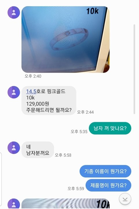 본인 : 작년에 반지를 구매했었는데, 다시 사려고 합니다. 혹시 사이즈랑 정보 알 수 있을까요? 주인 : 언제 구매하셨죠? 번호가 어떻게 되세요? 본인 : 2019년 *월에 샀고 번호가 이렇게 됩니다. 주인 : 아 네 찾은 다음에 다시 이 번호로 전화드릴게요~