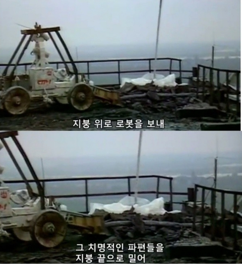 원자로에서 나온 잔해들의 방사선들이 어마어마해서 (90~120 시버트)