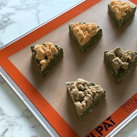 쑥반죽에 인절미와 흑임자 가루로 크럼블을 만들어서