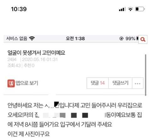그 글에 사진에 나온 애 아는 언닌데 부탁 받아서 대신 써 사진 본인도 아직 무슨 일인지 잘 모르고 당황하고 있는데... 글 보면 알겠지만 뭔 주소부터 사진까지 안 가리고 다 올려 놓았더라고 허락 받기는 개뿔 누가 저딴 글 올리는데 허락해 줘; 다행히 주소는 진짜 주소 아닌 거 같아 그리고 웃긴 건 쟤 이름도 서유빈이 아니야 ㅋㅋㅋㅋㅋㅋㅋㅋㅋㅋ 그냥 모르는 사이인데 sns에서 가져다가 쓴 건지 아는 앤데 이름까지 올리면 큰일 날 거 같으니까 지가 바꾼 건지 모르겠다