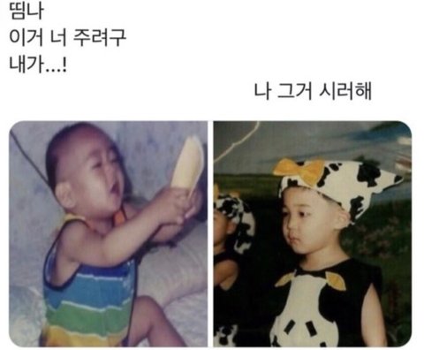 테 엄마랑 짐 엄마랑 친구라 비민이들도 뱃속에서부터 친구였음 어릴때부터 테가 짐 쫓아다니면서 짐나짐나^ㅁ^ 이러면 짐인이는 으응...응... 들이대는 테형이 좀 불편해 왜냠 짐인이는 약간 낯가린단말야 글서 애기때부터 인싸력 만땅인 테가 좀 어색하게 느껴짐 그치만 테형이의 엄청난 들이댐과 갖은 노력 끝에 즴인이도 마음을 열고 원래 성격이 나오기 시작함