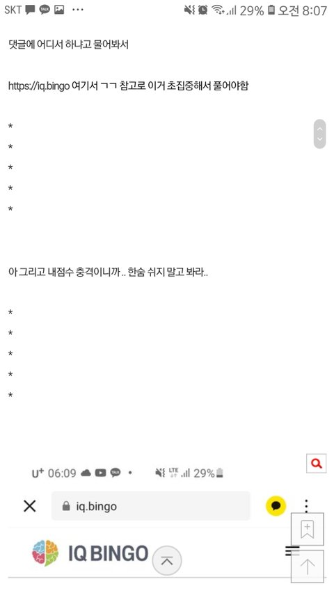 10대판에서 글 올리고 10분에 조회수 천씩 뛰더니 내가 광고 아니냐고 댓글 다니까 계속 같은 검사 사진 올리면서 묻으려고 한다ㅋㅋㅋㅋ 걔가 여기로 카테 바꿨길래 혹시나 하는 사람들 있을까봐 올림~ 점수가 낮든 높든 걍 다 6900원 내야 하는 거니까 속지마 나 30분동안 개진지하게 풀었는데 시간만 버림