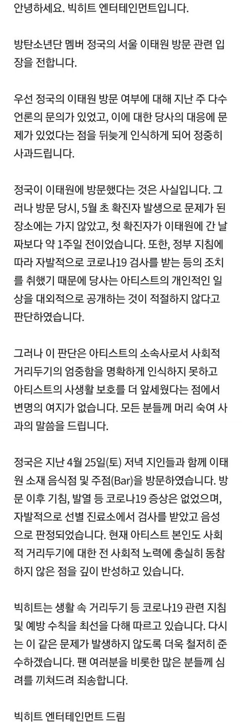 밑은 빅히트 공식 입장 전문