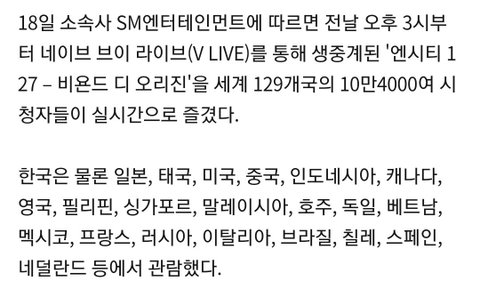 묻혔죠...새벽까지 참 좋았는데... NCT 127 비욘드 라이브 129개국에서 총 10만 4천여명이 시청 공연 매출액만 34억 현재까지 한 비욘드 라이브 중 제일 많은 나라와 관객수