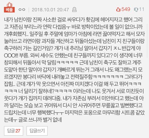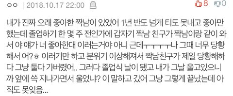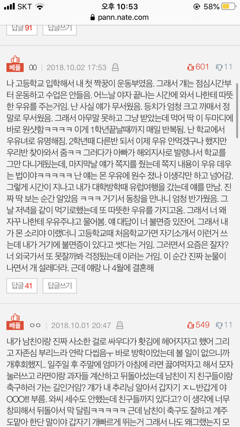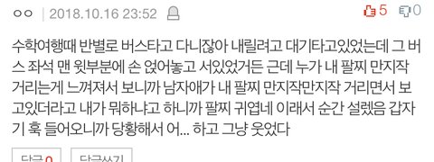 나랑 내 짝이 뒤돌아서 4명이 이야기 하는데 갑자기 내 바로 뒤에 앉은 남자애가 나 빤히 보면서 "와 근데 너 진짜 이쁘다...." 이러는거 당황해서 웃었는데 진짜 설렜다...