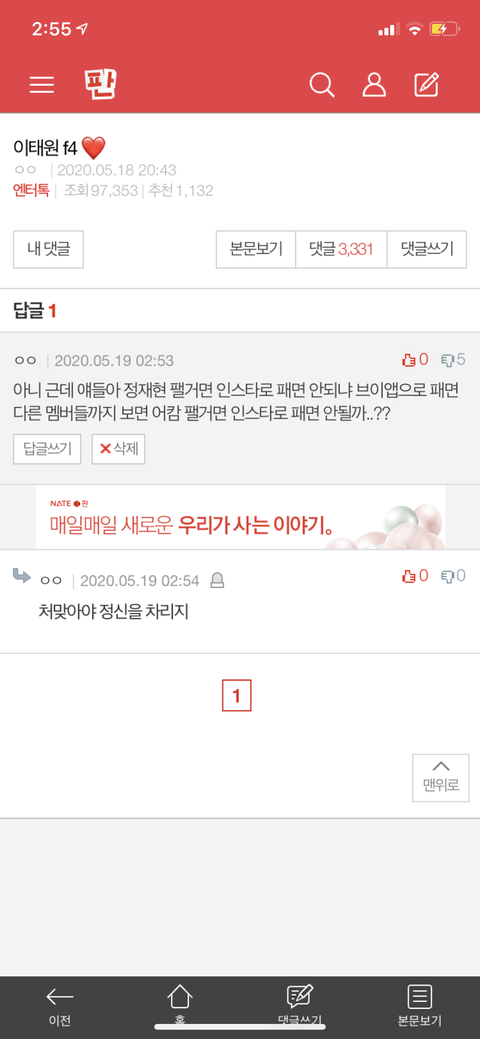 이게 어쩔 수 없는 일이야?? 일부러 팬다는 워딩 썼는데 이 아래로 어쩔 수 없다고 지가 책임 져야 한다는데 굳이 그걸 멤버들이 보는 자리에서 해야 할까 싶네...ㅠㅜ 어이털려서 댓삭함... 신고나 열심히 해야지
