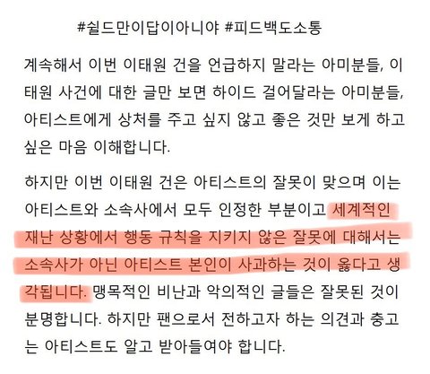 계속해서 이번 이태원 건을 언급하지 말라는 아미분들, 이태원 사건에 대한 글만 보면 하이드 걸어달라는 아미분들, 아티스트에게 상처를 주고 싶지 않고 좋은 것만 보게 하고 싶은 마음 이해합니다. 하지만 이번 이태원 건은 아티스트의 잘못이 맞으며 이는 아티스트와 소속사에서 모두 인정한 부분이고 세계적인 재난 상황에서 행동 규칙을 지키지 않은 잘못에 대해서는 소속사가 아닌 아티스트 본인이 사과하는 것이 옳다고 생각됩니다. 맹목적인 비난과 악의적인 글들은 잘못된 것이 분명합니다. 하지만 팬으로서 전하고자 하는 의견과 충고는 아티스트도 알고 받아들여야 합니다.