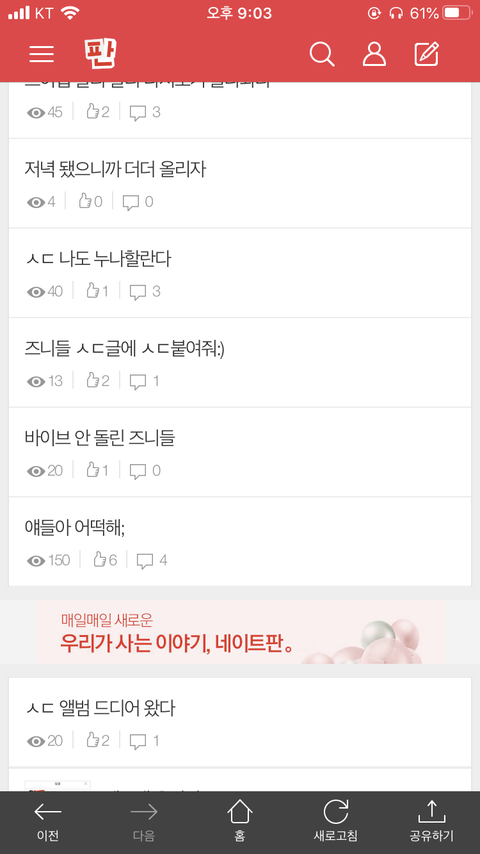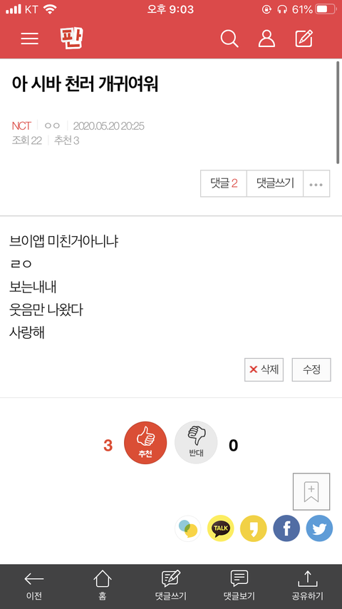 내가 쓴글 들어가서 보면 잇는데 팬톡 목록에서는 없음 ㅠㅠ 원래 누나할란다랑 ㅅㄷ붙여주라는 글 사이에 내글 잇는뎅 힝.. 왜 이런거야??