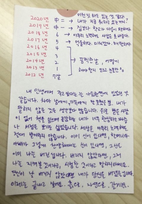 근데 국어 선생님들은 눈치 채더라. 언니 힘든거. 언니가 글쓰는 거 보면 자꾸 가정에 대한 쪽으로(뭐 가정의 이상향 같은거? 그리고 가족얘기하면 동생이랑 엄마 얘기만 하고. 사랑하는 부모님 안하고 사랑하는 엄마 하고.) 쓴대... 언니 중학교 국어쌤이 내 국어쌤이기도 해서...