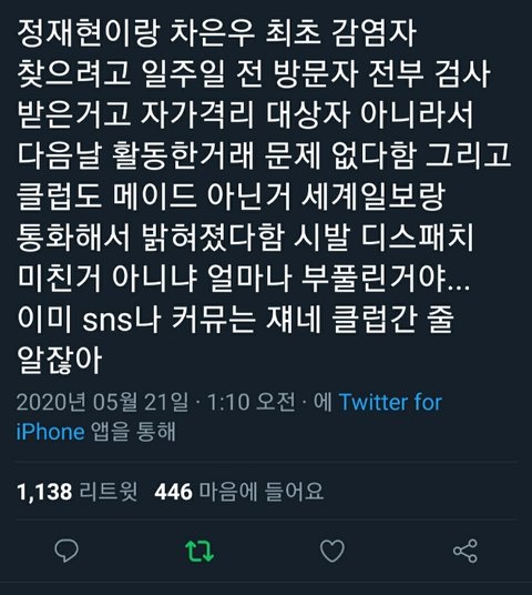웃기고 자빠졌네. 질본에서 해당기간 방문자 와서 검사받고 음성이여도 외출자재 자가격리2주 권고였어. 진짜 빠순이들 구역질 난다. 음성이여도 2주 후에 재검사 마지막에 양성나오는 20.30.대 많어. 무증상으로. ㅈㄹ ㅋㅋㅋㅋ 뉴스를 봐야 머 세상 돌아가는걸 알지 ㅋㅋㅋ 잘못한거 인정 좀 해라. 질린다.
