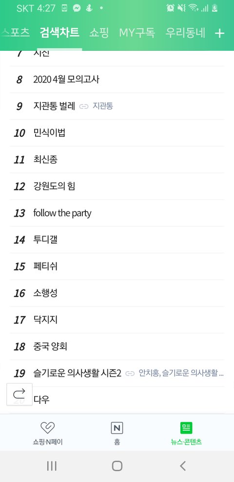 아니 지금 실검 봤는데 범털이라는 영화가 10대 빼고 모든 연령대에 있어. 그리고 강원도의 힘? 그건 옛날 건데도 10대 거에도 있더라. 2020 4월 모고는 3,4,50대도 다 있고 10대가 다우를 검색할 일이 있나? 난 이번에 첨 들었거든. 혹시 내가 인터넷 잘 안 해서 모르는 건가 싶어서. 사진은 10대 거야!