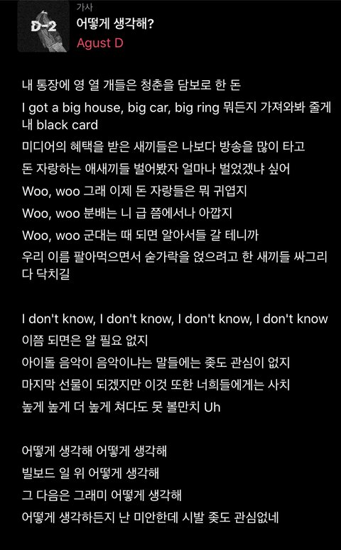 소감 적고 가셈. 나 평소 슈가 랩 좋아해서 간간히 듣는데아직 안들었거든? 나를 더 두근거리게 하기 위해서 소감을 적고가봐
