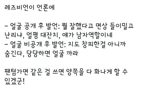근데 인터뷰 한걸 왜 욕하는거야? 그러면 이성애자 부부가 유튜브 활동 하는것도 관종이니까 욕먹어야겠네 그리고 제목에 떡하니 레즈비언 이라고 써있는데 보기 싫음 그냥 지나치면 되지 굳이 타자까지 입력하면서 욕하는 심리를 모르겠네