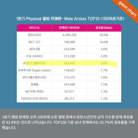 우선 에이티즈 1분기 앨범판매량이야(컴백은 1월에 했어) 초동은 6만 2천장 정도인데 해외팬덤이 훨씬 큰 그룹이여서 총판이 훨 높은 편이야. 물론 잘나가는 다른그룹들과 비교하면 그렇게 잘파는건 아니지만 "한국에서 알려진거에 비해" 잘판다는 소리야.