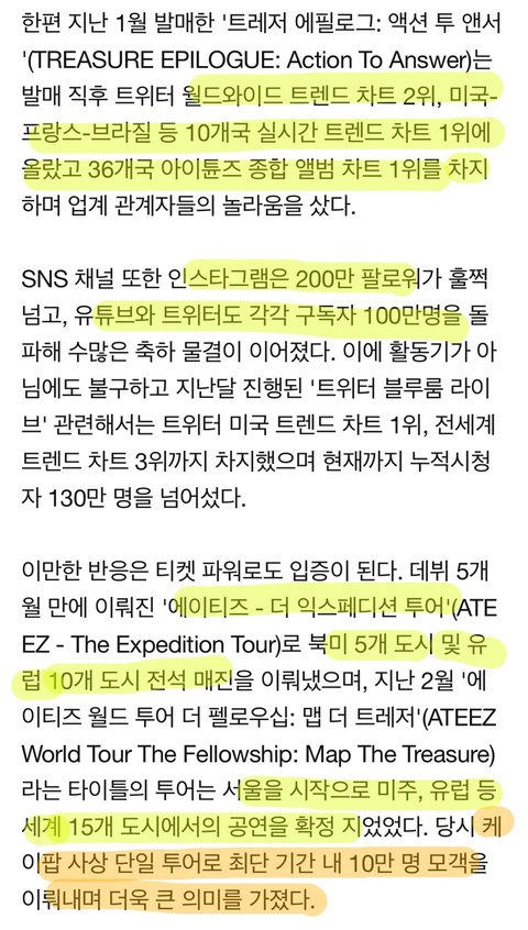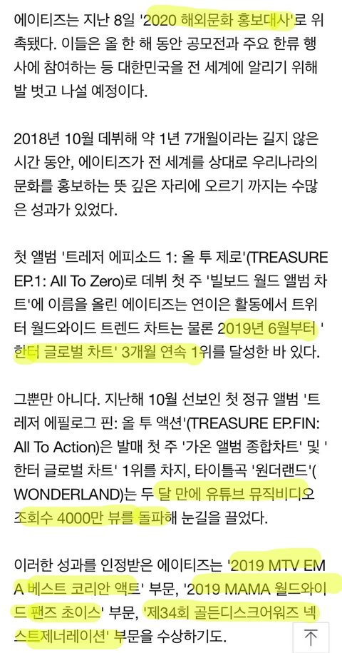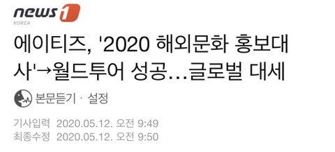 밑에는 에이티즈가 2020년 해외문화 홍보대사가 된거에 대한 기사인데, 에이티즈 어떤 성적들이 있는지 한눈에 보기 쉬울 것 같아서 가져와봤어.