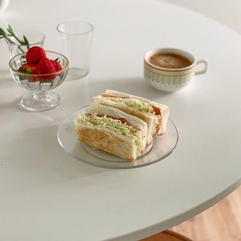 식빵 위에 양상추 → 머스타드 → 계란프라이 → 케챂 → 피클 → 양파 순으로 올려주고 나머지 식빵으로 위에 덮어줌. 원기둥 모양의 긴 유리컵에 우유도 부어주고 식탁을 닦음 다음 만든 토스트를 맛있게 먹음.