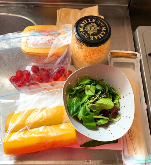집에서 놀고 있는 소면, 언제 나올지 몰라 쟁여두는 한국산 청양 고추, 쫌 질긴듯한 단무지, 좋아하는 방토, 베이비 리브~비빔장으로는 설탕, 고추장, 고추가루, 참깨, 마늘, 발사믹, 식초로