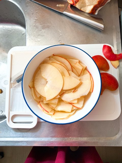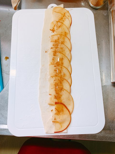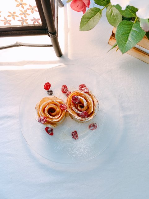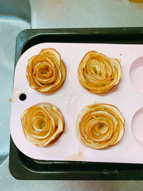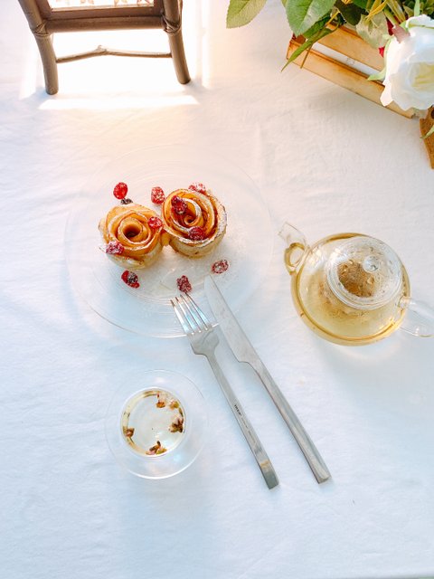 장미 사과파이& 복숭아 꽃차재료는 사과 1개, 강력분100그램, 드라이 이스트 1티스픈, 꿀, 시나몬 파우더 반죽이 발효되는 사이 사과를 슬라이스하고 달달한 설탕물에 담궈 전자렌지에 2분정도 돌려준다. 어느 정도 밀어 지면 길게 반을 가르고 다시 조금 더 얇게 밀어준다.펴 놓은 반죽위로 먼저 준비해둔 사과를 얹고 시나몬 파우더와 꿀로 향과 맛을 내고오븐에서 꺼내면 살짝 모양이 바뀐 장미 사과파이가 완성이다.입맛에 맞게 시럽이나 꿀등으로 맛을 더하고