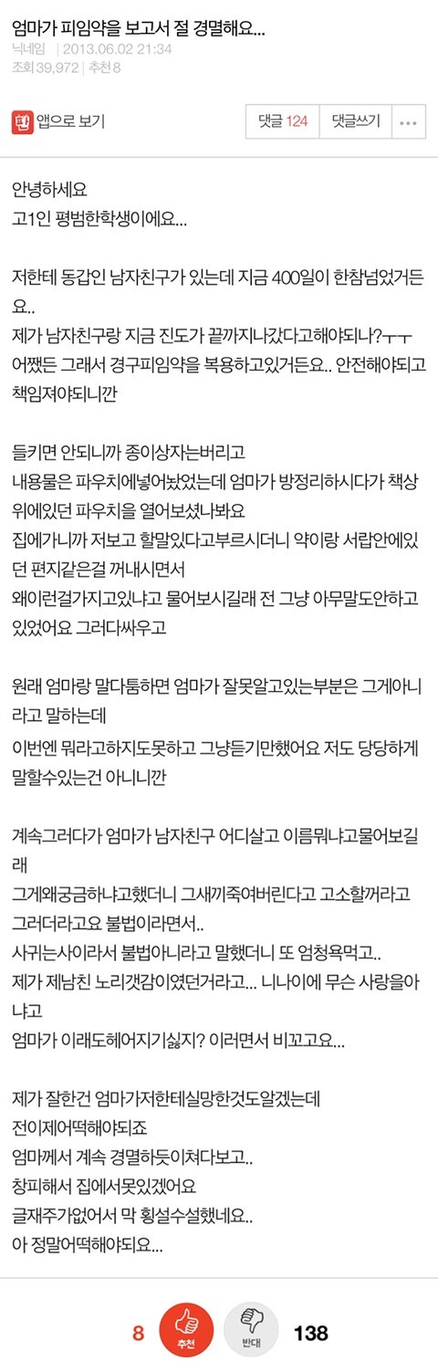 7살 딸아이를 키우는 입장에서 엄마입장 너무 이해되는데요? 고1까지 애지중지 키워놨더니 피임약까지 먹어가며 남자랑 그짓하고있다고 생각하면 피가 거꾸로 돌것같은데....