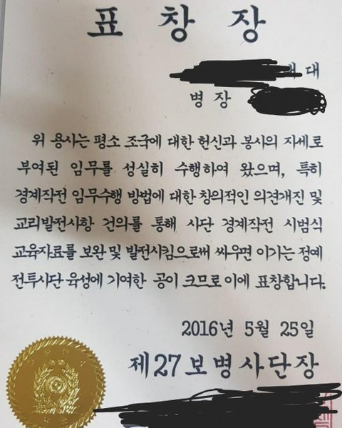 그리고 얼마 뒤에 사단장표창이 날라왔습니다. 사단 내 병사가 행사말고 이렇게 받는게 최초랍니다.기분이 째지는데 휴가를 다 쓰질 못했습니다...길게 못나가게 해서....슈ㅣ발...