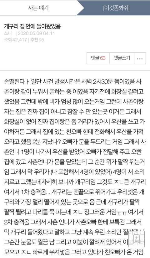 ))인기는 별로 없었지만..(( 아니 나 개구리 사건쓴 사람인데.. 그때 올리고 안 보고 있었는데 오랜만에 들어오니까.!..?.? ㅎㅎㅎ 신기해 나 글 처음 써봤는데 관심 가져줘서 고마워요 모든게 신기기ㅣ