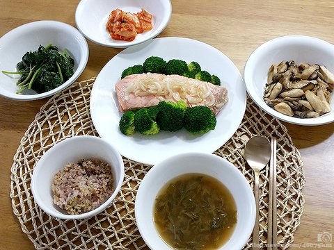 (잡곡밥, 브로콜리를 곁들인 삶은 연어, 쑥 국, 취나물 무침, 모듬버섯 볶음, 마트표 김치)