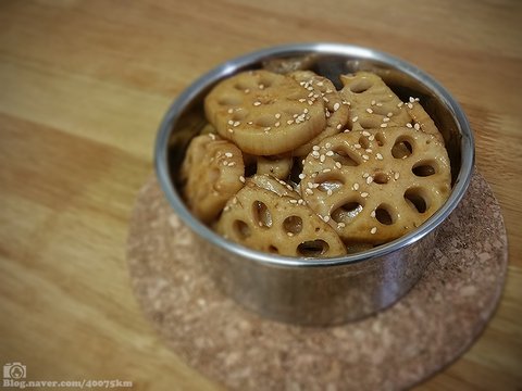 연근이 어느 정도 익으면 물을 버리고 한 번 헹군 다음 양념을 넣고 뒤척이며 조린 다음 통깨를 살짝 뿌려주면 완성.