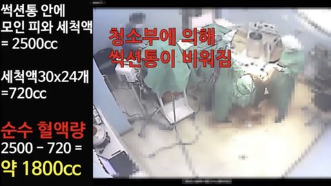 #6. 이 과정에서 출혈량은 3500ml 였고, 바닥의 피를 닦기 위해 9번의 밀대질을 함. 3500ml는 일반 성인남성 전체혈액인 5000ml의 70%에 해당. 수혈은 없었음.