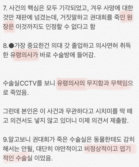 #8. 권씨의 상태가 좋지 않음을 뒤늦게 파악하고, 대학병원으로 옮겼으나 끝내 사망함.