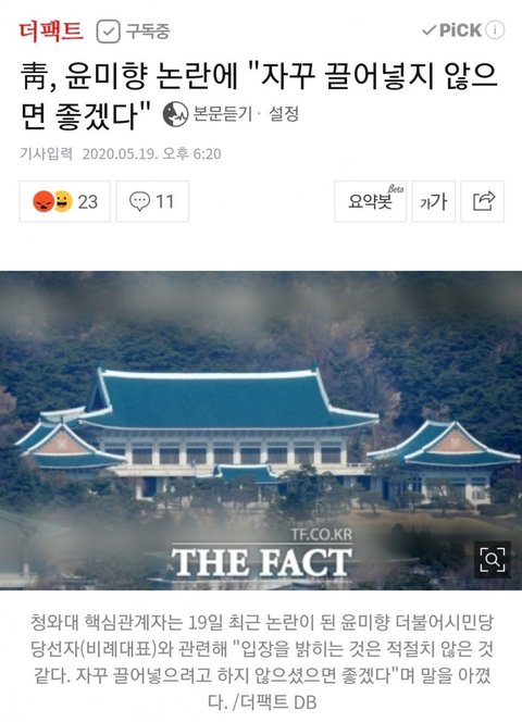청와대: "윤미향 논란에 입장 밝히는 것 부적절..."