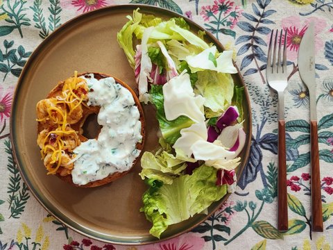 콜리플라워 두꺼운베이컨 양파를 익혀담고 남은공간은 으깬 고구마샐러드로 채워요