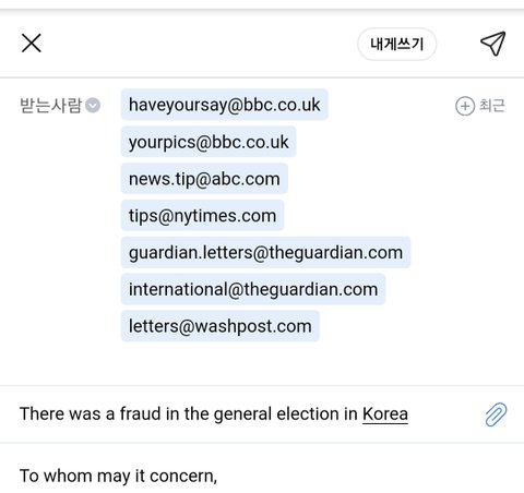 안녕하세요, 저는 한국의 평범한 시민입니다. 저는 당신께 이번 4.15 총선에서 커다란 부정이 있었다는 점을 말씀 드리고 싶습니다.