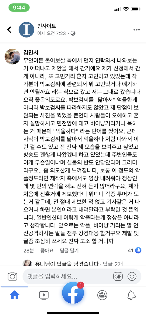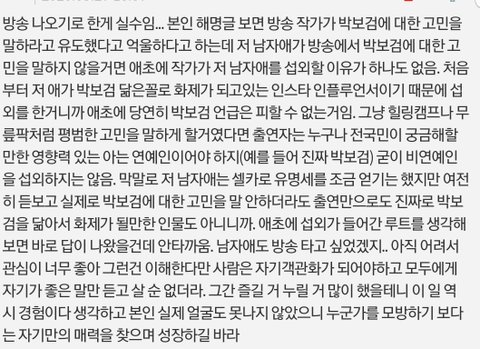 자꾸 해명 같지도 않은 글 싸지르면서 본인 무덤 더 파는 듯. 다른건 모르겠고 방송에 나온 본인은 원래 본판이 아니고 사진이 진실이라고 믿는거 같은데 아무리 얼굴이 붓고 컨디션이 안 좋아서 평소랑 달라보인다고 해도 사진과 방송 갭 차이가 엄청남. 잘 안 알려졌을때 초반에 소수 사람들이 쫓아가서 사진 보고 박보검 닮았다니까 믿기 시작하면서 아예 맹신하나본데 어쨌든 사진 속의 너도 티비 속의 너도 너임. 방송카메라가 찌그러져서 그렇게 보인거라면 인정함.