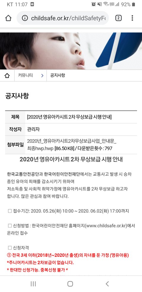 요즘 카시트 알아보다가 무상으로 보급하길래 신청해보려고하는데