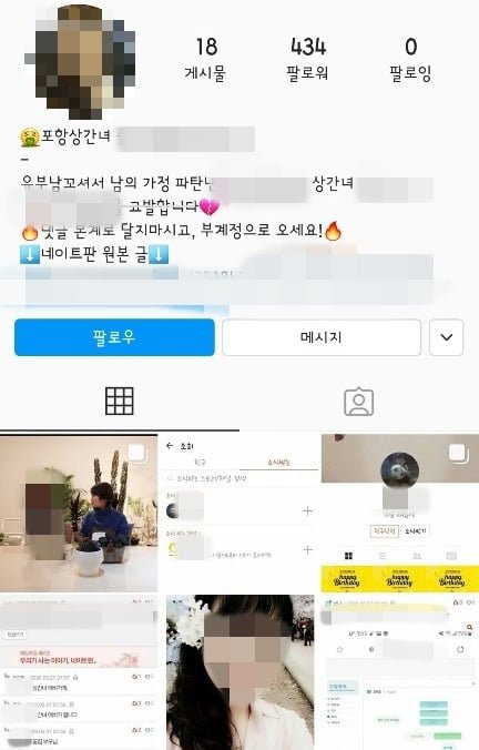 글 작성자는 "상간녀는 포항에서 꽃집을 하며 부케도 만드는 여자"라며 "신혼집에 상간녀 홈웨어, 그 상간녀 꽃집 이름이 적힌 화분 등을 일부러 놓고 간 적도 있었다. 딸아이가 정성으로 고른 혼수를 먼저 사용하고, 음식도 해 먹이고, 잠도 자고 했더라"라고 전했다.