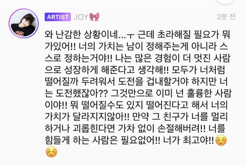 근데 타팬들이 오해할까봐 쓰는데 조이가 팬들한테 댓글이나 뭐 반응할때는 또 성의있게 함.., 팬 무시하고 그런애는 아닌데 소통 적은게 서운해서 이러는거임
