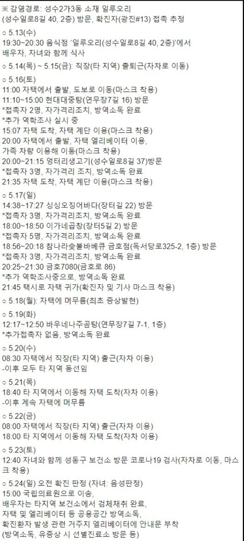 심지어 자신과 접촉했던(자신을 감염시킨)광진 13번 확진자가 21일 확진판정을 받았는데도 22일에 출근함.