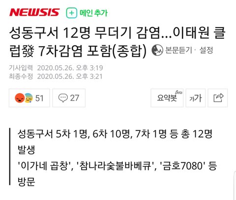 27일 기준 알아본 바 성동 23번 확진자가 직접 감염시킨 사람만해도 11명(성동 24,25,26,27,28,30,31,32,33,34 금천14) 감염자의 접촉자(성동 29,36,37)까지 포함하면 14명이나 돼.